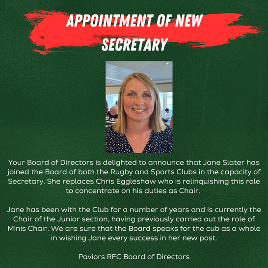 Your Board of Directors is delighted to announce that Jane Slater has joined the Board of both the Rugby and Sports Clubs in the capacity of Secretary. She replaces Chris Eggleshaw who is relinquishing this role to concentrate on his duties as Chair. Jane has been with the Club for a number of years and is currently the Chair of the Junior section, having previously carried out the role of Minis Chair. We are sure that the Board speaks for the cub as a whole in wishing Jane every success in her new post.