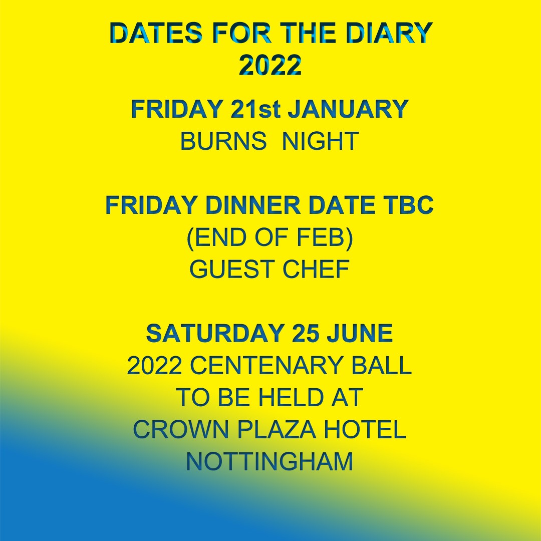 In January to Celebrate the Scottish poet Robbie Burns, we have a traditional Burns Night. The previous one in 2019 was an exceptional evening and we will undoubtedly be aiming for the same kind of fabulous night. In February there is Friday Night dinner with a Guest Chef, date to be confirmed but will be towards the end of that month. To recognise our Centenary year in 2022 a Ball will be held at the Crown Plaza Hotel in town.