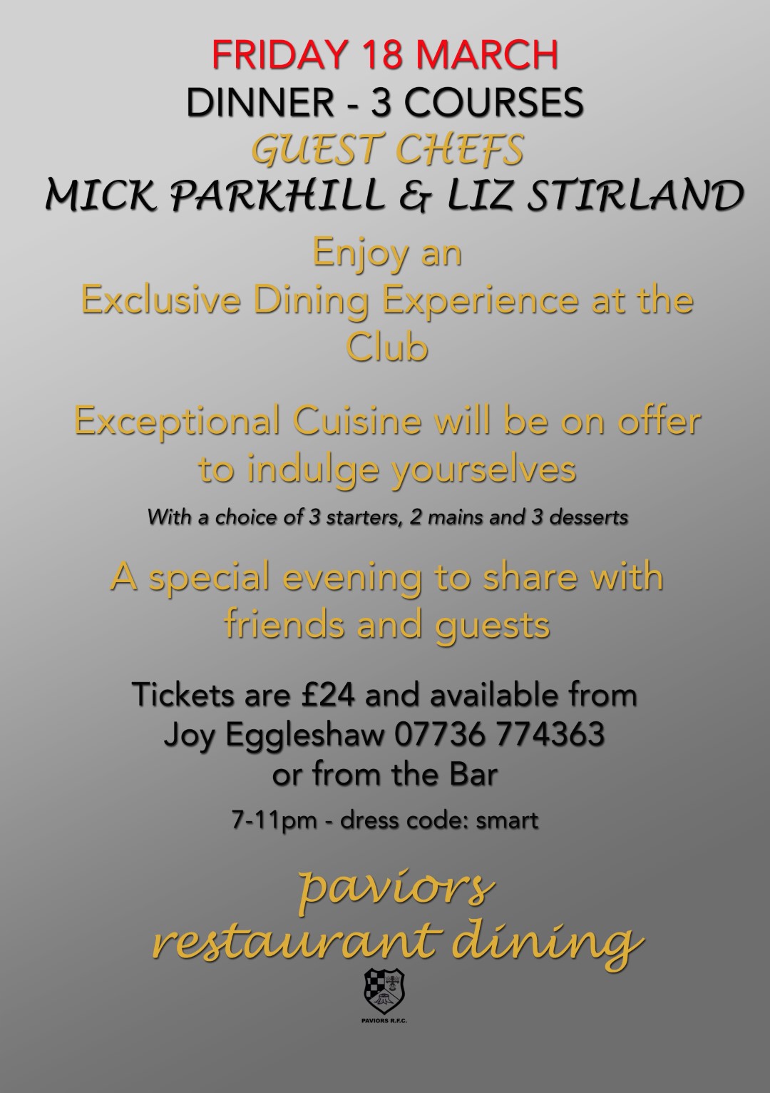 Be part of a fabulous culinary evening, chose from 3 starters, 2 mains and 3 desserts.
