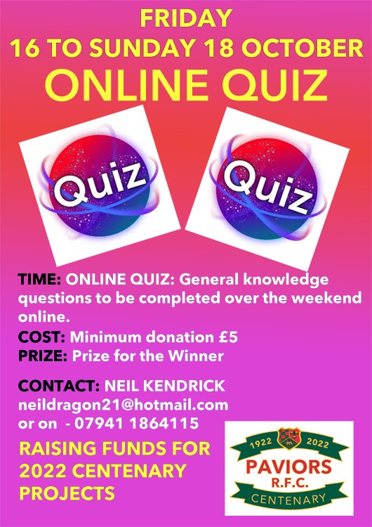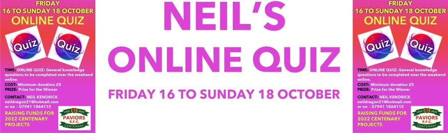 Neil's Online Quiz starts this evening, be great to have you on board. Compete virtually against your family and friends, the questions will be emailed out to you tonight and answers should be returned to Neil by 9pm Sunday night, results and prize giving will be on Monday the 19th.