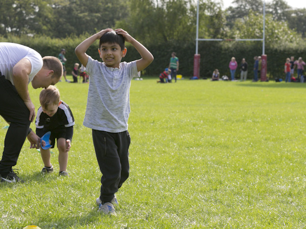 Description: Fun Warm-Up involving games based around scoring tries on different coloured cones, simple passing techniques which we get the parents involved with, basic movement development game in teams were they have to run relays through posts and over steps etc... we also get a ball involved once they progress in this one.