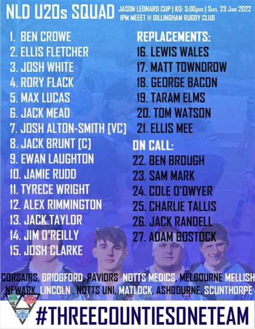Six of our Under 20's players have been selected for the NLD Under 20's Squad to play their first match of 2022 in the Jason Leonard Cup, this Sunday at Billingham rugby club, Kick-off 3pm. They are:
