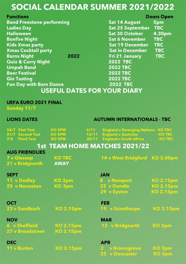The first event is a live music event on Saturday 14 August 5pm onwards, with the band Freestone performing. Why not make it 'an afternoon session at the Stump' , preceeding Freestone the 1st Team will have a friendly against West Bridgford, kicking off at 2pm.