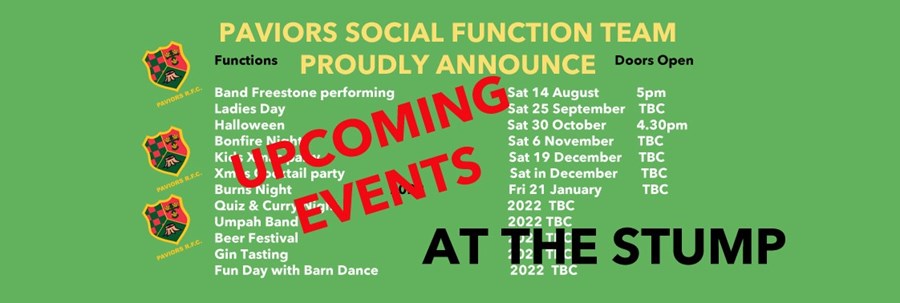 Paviors Social Function Group have been working hard to bring a full Calendar of Events to the Stump over the summer and into next Season. We have functions for adults and children together with family events.