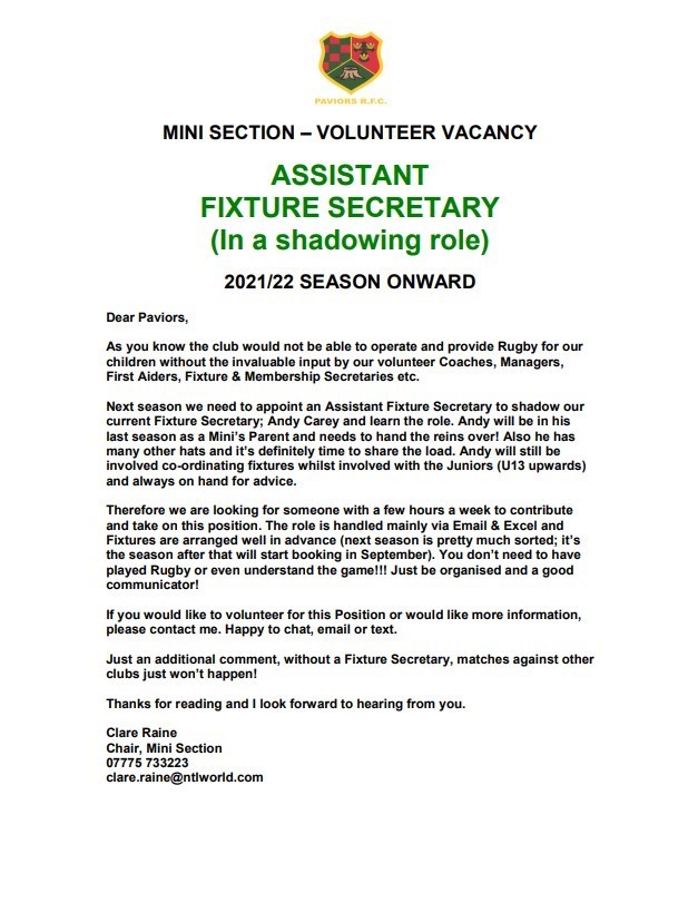 The Mini's Section (Under 6 to Under 12) has a volunteer vacancy. Please, without Volunteers our Club isn't what it is! If you can help or know someone who can, get in touch.